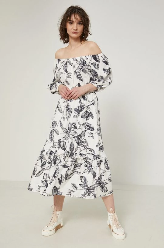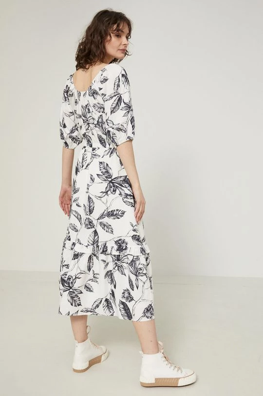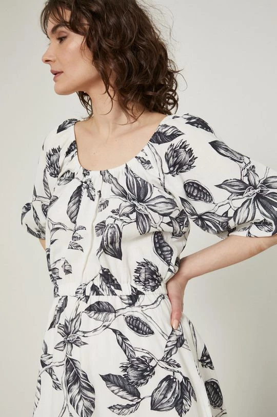 Φόρεμα από τη συλλογή Medicine. Ανοιχτό μοντέλο από ύφασμα με σχέδια.