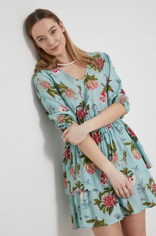Φόρεμα από τη συλλογή Medicine. Ανοιχτό μοντέλο από ύφασμα με σχέδια.
